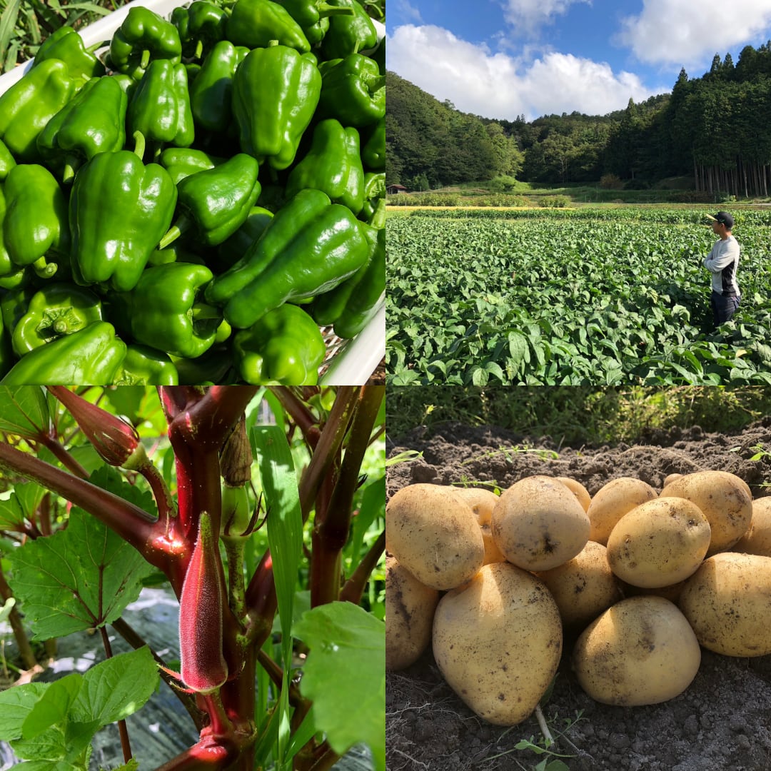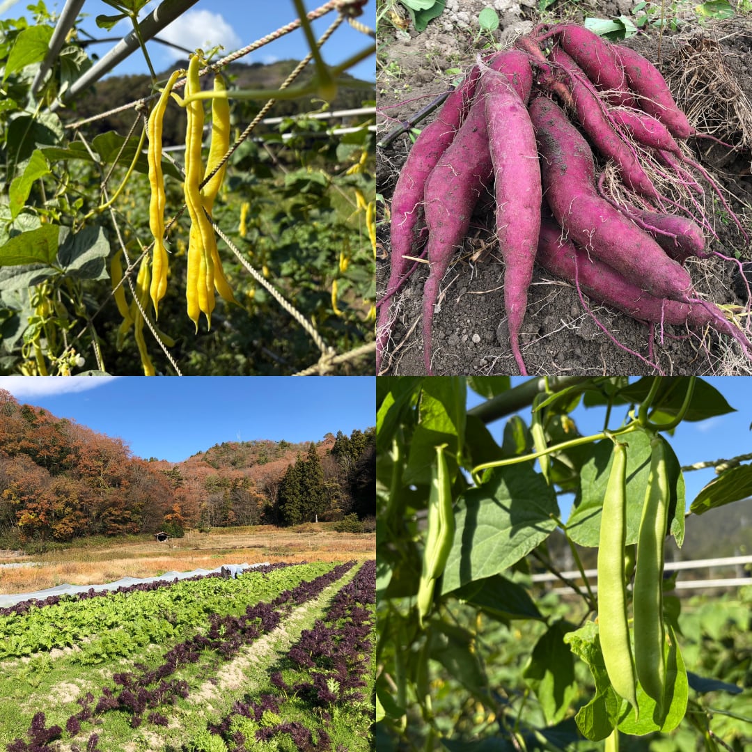 ピーマン・完熟赤万願寺とうがらし(甘とうがらし)・黄インゲン・真珠豆サヤ・さつまいもなど